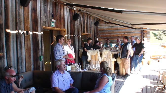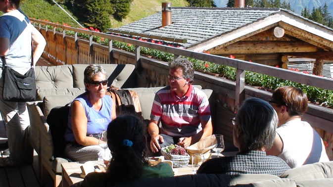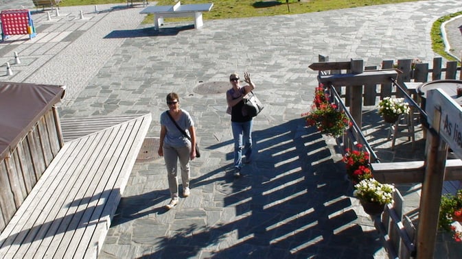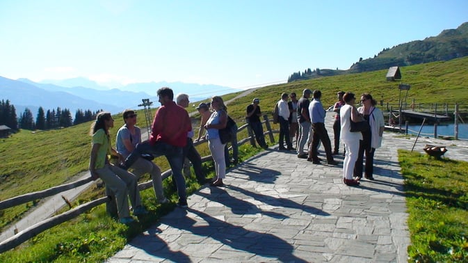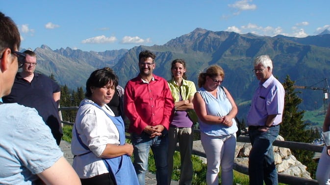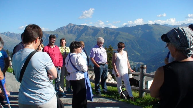Es gibt einen kleinen Spaziergang auf der Terrasse des Madrisahofes und dann hören die Teilnehmen aufmerksam ...