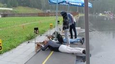 … besammeln sich alle vor der Biathlon Arena. Dort werden die Teilnehmer in zwei Gruppen aufgeteilt. Eine Gruppe geht hinauf zum Schiessstand …